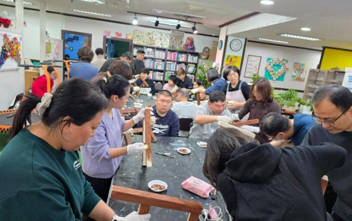 발달장애인들이 DIY체험 활동에 푹 빠져 있다.목재판에 색을 칠하고 말리며 만들어진 의자에 다시 예쁘게 노랑색을 칠한다.발달장애인주간활동센터 뜨레봄은 목재를 활용하여 직접 만들어 보는 체험활동을 통해 또 다른 즐거움을 만끽한다.