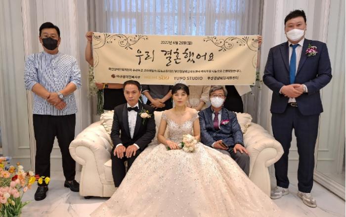 우리 결혼했어요'…마산장애인복지관, 후원자들과 함께 결혼 지원마산장애인복지관은 지역 후원자들과 함께 어려운 경제적 상황으로 결혼식을 올리지 못한 11살 자녀를 둔 부부의 결혼식을 지원했다고 26일 밝혔다.이번 결혼식은 부산·경남웨딩지원센터와 결혼업체 브라이덜수의 지원으