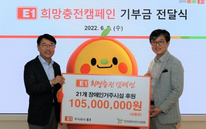 E1, 장애인 복지시설 21곳에 1억500만원 전달8일 서울 용산구 소재 E1 본사에서 전진만 E1 대외협력실장(왼쪽)과 정석왕 한국장애인복지시설협회 회장이 희망충전캠페인 기부금 전달식에서 기념 촬영을 하고 있다. (사진=E1 제공) *재판매 및 DB 금지[서울=뉴시스