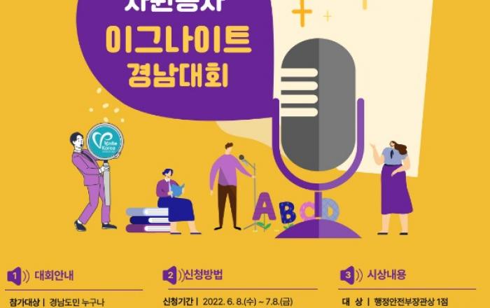 ‘5분의 울림! 자원봉사로 물들이다.’2022년 자원봉사 이그나이트 경남대회 발표자 모집경상남도자원봉사센터는 9월에 개최되는 ‘2022 자원봉사 이그나이트 경남대회’에 참여할 발표자를 2022. 6. 8.(수) ~ 7. 8.(금)까지 모집한다.이그나이트(ignite)란