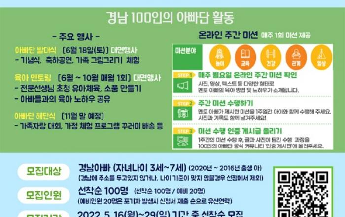 “초보 육아아빠 탈출” 경남 100인의 아빠단 모집육아 초보 아빠들이 선배 아빠에게 육아 노하우를 배울 수 있는 기회5월 29일까지 경남 100인의 아빠단 4기 모집 경상남도와 인구보건복지협회 경남지회는 저출생 극복을 위한 지역 네트워크 구축 및 인식개선사업의 일환으로