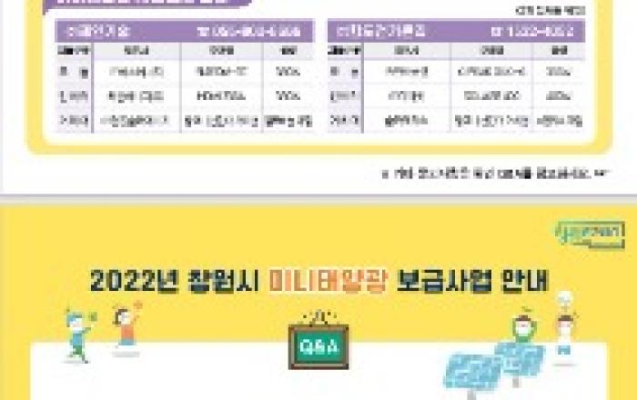 *2022년 창원시 미니태양광 보급 지원사업 안내1. 사업개요 ❍ 지원대상 : 창원시 공동주택(아파트, 빌라, 원룸) 및 단독주택(베란다형 가능가구) ❍ 사 업 량 : 200가구 정도(선착순) ❍ 설치비용 : 750천원/1세트 - 지 원 금 : 1W