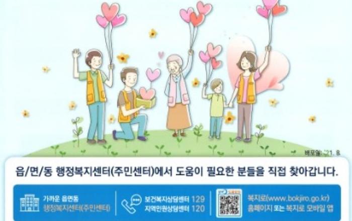 겨울철 복지위기가구 집중발굴 기간 운영 안내우리 주변의 어려운 이웃을 찾고 지원하기 위해 "겨울철 복지위기가구 집중 발굴 및 지원" 기간을 운영하고 있습니다.우리 주변의 어려운 이웃을 알려주세요, 여러분의 관심이 그 분들에게 큰 도움이 됩니다.○ 기 간 :