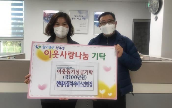 현대자동차서비스안민점, 임인년 새해 성금기탁창원시 안민동 소재 현대자동차서비스안민점(대표 임해운)에서는 3일 임인년 새해를 맞아 성주동(동장 최영숙)에 100만원을 기탁하였다.이날 기탁한 성금은 그동안 안민동에서 오랫동안 서비스업에 종사하면서 지역내 어려운 이웃들을 도