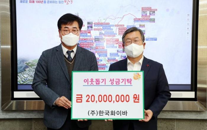 이진광(왼쪽) ㈜한국화이바 대표이사가 불우이웃돕기 성금 2000만 원을 밀양시에 기탁 후 기념촬영을 하고 있다.어려운 이웃에 해마다 따뜻한 손길 내민 밀양 대표기업한국화이바, 성금 2000만원 기탁...취약계층 주거ㆍ난방비 등에 사용성금ㆍ생필품 등으로 매년 `선행`이진