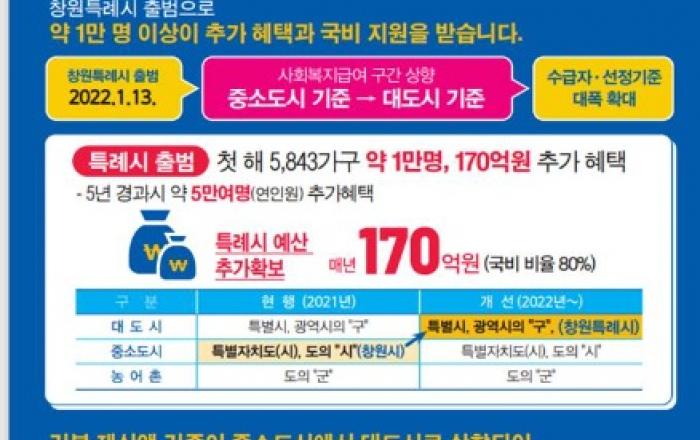 더 확대되고 늘어나는 광역시와 동일한 복지급여 지원!!2022. 1. 13. 창원특례시 출범에 따라 광역시와 동일한 복지혜택 지원됩니다.지금 행정복지센터로 문의하세요.