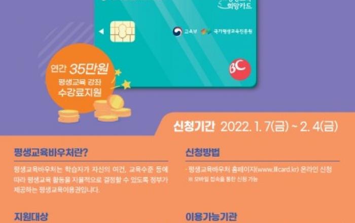2022년 평생교육바우처 신청 안내교육부에서는 저소득층을 대상으로 평생교육 참여 기회를 보장하기 위하여평생교육바우처 지원사업을 추진하고 있습니다. 가. 사 업 명 : 평생교육바우처 지원사업 나. 지원대상 : 만19세 이상 성인(2003년 1월 1일 이전 출생자)