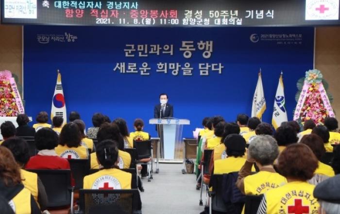 대한적십자사 함양중앙봉사회 결성 50주년 기념식 개최"인도주의 바탕 다양한 활동 펼칠 것"대한적십자사 경남지사 함양중앙봉사회 결성 50주년 기념식이 8일 오전 서춘수 군수, 황태진 군의장, 김재웅 도의원, 대한적십자사 경남지사 임군빈 사무처장, 이경숙 함양지구협의회장,
