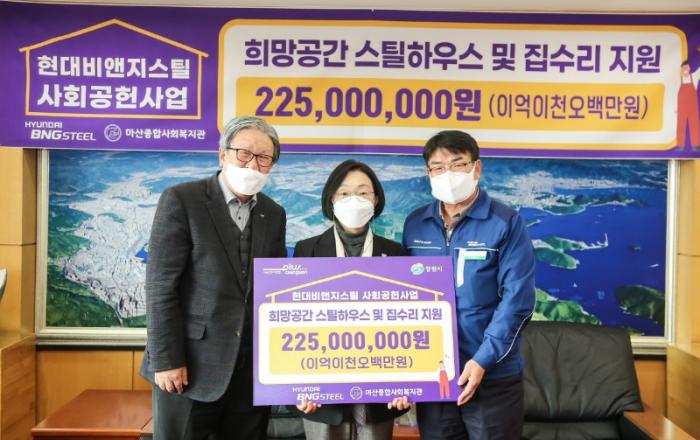 현대비앤지스틸(주), 창원시에 2억2500만원 기탁저소득가정에 스틸하우스 및 주거환경개선 집수리 사업 전개창원시(시장 허성무)는 16일 현대비앤지스틸(주)(대표이사 정일선)이 저소득가정 주거환경개선 사업비로 2억2500만원을 기탁했다고 밝혔다.사업비는 중앙사회복지공동모