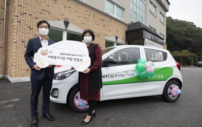 KT&G복지재단, 전국 사회복지기관에 경차 150대 지원▲19일 용인시에 위치한 은이너싱홈 요양원에서 진행된 ‘2021 사회복지기관 차량 지원사업 전달식’에서 강지형 KT&G복지재단 사무국장(왼쪽)과 김진순 은이너싱홈 시설장(오른쪽)이 기념촬영을 하고 있다.KT&G복지