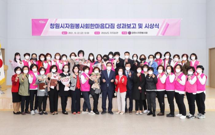 창원시자원봉사회 한마음 다짐대회 열려2021년 봉사활동 성과보고 및 우수봉사자 시상창원시(시장 허성무)는 22일 ‘2021년 창원시자원봉사회 한마음 다짐대회’를 열어 한 해의 봉사활동 성과보고 및 우수봉사자 시상식을 가졌다고 밝혔다.시는 코로나19 어려운 여건 속에서도