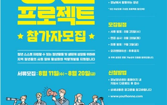 경남청년센터, 청년 프로젝트 지원 사업 참여자 모집총 6팀 선정, 팀당 최대 500만 원 활동비 지원청년 이슈 발굴 및 정책 연구를 통한 청년의 지역사회 참여 활성화 경상남도와 경남청년센터는 청년들의 지역사회 참여 활성화 및 활동 지원을 위한 ‘청년 프로젝트 지원 사
