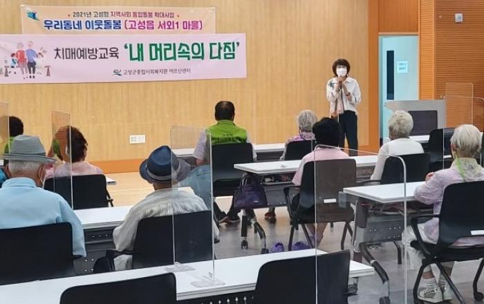 고성군어르신센터, 치매예방 프로그램 개최[복지지원과]- 매월 지역주민 대상 치매에 대한 사회적 관심과 지역자회 인식 개선 기대고성군어르신센터(센터장 손윤정 고성군종합사회복지관장)는 8월 19일 고성군종합사회복지관 분관 ‘모두의 강당’에서 고성읍 서외1마을 돌봄대상 어르
