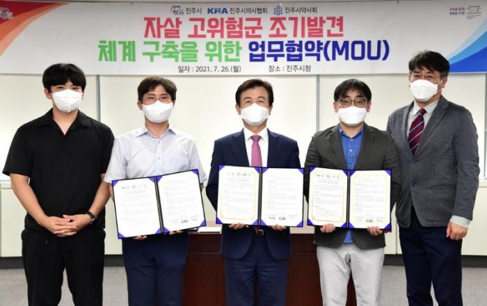 진주시-진주시의사회-진주시약사회, ‘우리동네 마음이음 사업’협력- 자살 고위험군 조기발견 체계 구축 업무협약 체결 -진주시와 진주시의사회, 진주시약사회는 지난 26일 진주시청 상황실에서 ‘우리동네 마음이음 사업’의 일환으로 자살 고위험군 조기발견 체계 구축을 위한 협약