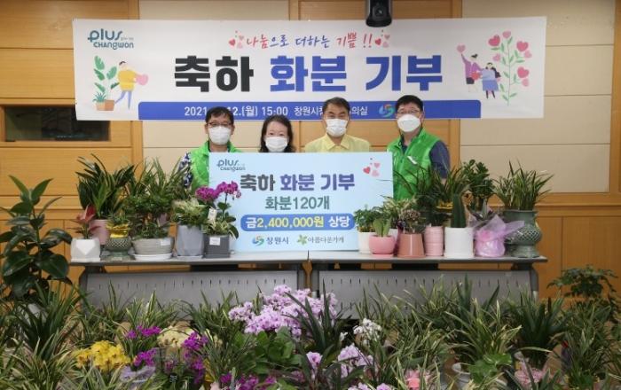 창원시, 축하 화분 기부…“나눔으로 기쁨 더해요”승진, 영전 등 축하 화분 120개(240만원 상당)창원시(시장 허성무)는 12일 직원 축하 화분 120개(240만원 상당)를 아름다운가게에 기부했다고 밝혔다. 이날 기부는 지난 1일자 인사이동에 따른 승진, 영전 선물