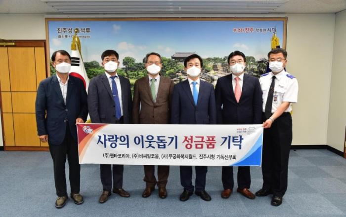 진주시복지재단, 기관·단체 이웃돕기 성금품 기탁 이어져- 코로나19로 어려운 이웃들에게 도움이 되고자 기부 -진주시복지재단(이사장 이성갑)은 7일 오후 3시 진주시청 기업인의 방에서 지역사회 기관‧단체들의 성금품 기탁식을 가졌다.(주)펜타코리아(대표 조원찬) 성금 60