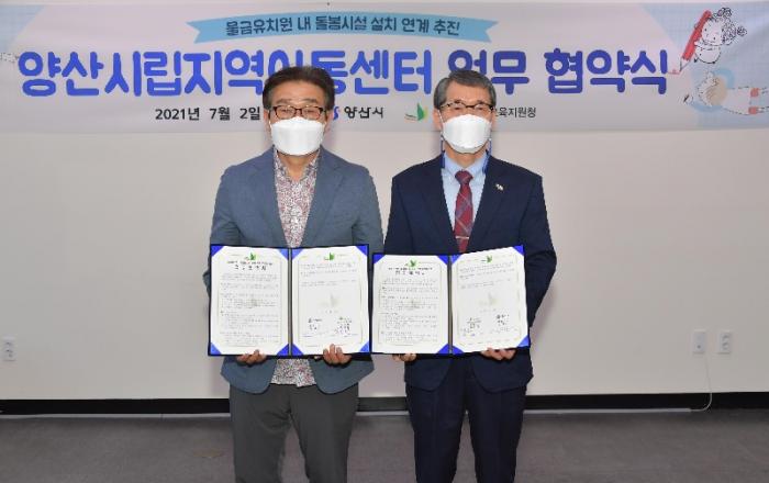 양산시립지역아동센터 설치 연계 추진 업무협약((2021. 7. 2. 상황실)양산시립지역아동센터 설치 연계 추진 업무협약- 양산시-양산교육지원청, 물금유치원 부지 돌봄시설 설치 상호협력 -양산시(시장 김일권)는 2일 경남양산교육지원청과 물금유치원 내 양산시립지역아동센터
