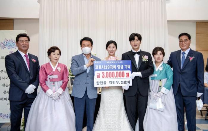 합천읍 김민우·정효실 부부,코로나19 극복 성금 300만원 기탁합천군(군수 문준희)은 지난 27일 합천군 문화예술회관에서 결혼식을 올린 합천읍 김민우·정효실 부부가 코로나 19로 어려움을 겪고 있는 군민들을 위해 써 달라며 300만원을 기탁했다고 밝혔다.이날 12시 문