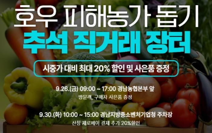 9월30일, 공공기관 5개소 공동 주최추석맞이 호우피해지역 농특산물 직거래장터 열려 - 경남지방중소벤처기업청 주차장에서 호우피해지역 22 농가 참여- 시중가격 대비 10%~35% 할인된 가격으로 농특산물 판매 경상남도(도지사 박완수)는 30일 경남지방중소벤처기업청 주차
