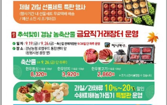 경남도, 9월 26일 경남 농협본부 앞호우피해 농가 돕기 추석맞이 직거래장터 개최 - 호우피해 농가 돕고, 우수 농특산물 합리적 가격에 구매하세요!- 10~20% 할인된 가격, 구매 고객 대상 장바구니, 잡곡 꾸러미 증정 경상남도(도지사 박완수)는 오는 9월 26일 경