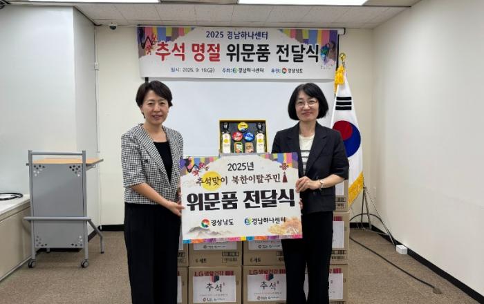 “북한이탈주민에게도 따뜻한 추석을”경남도, 추석 맞아 북한이탈주민 위문품 70세대 전달 - 19일, 경남하나센터에 식료품 선물세트 70개 전달- 도민 온정 담긴 위문품 전달로 지역사회 조기 정착 지원- "함께하는 따뜻한 한가위" 북한이탈주민 격려 및 나눔 실천 경상남도