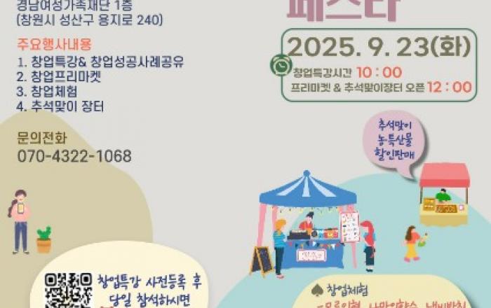 창업특강·프리마켓·체험이 한자리에,‘경남 여성창업 잡-브릿지 페스타’ 개최 - 23일, 경남여성가족재단에서 여성 창업 활성화의 장 열려- 창업특강·멘토링·프리마켓·창업체험 등 다채로운 프로그램 마련 경상남도(도지사 박완수)는 오는 23일 경상남도여성가족재단에서 여성 창
