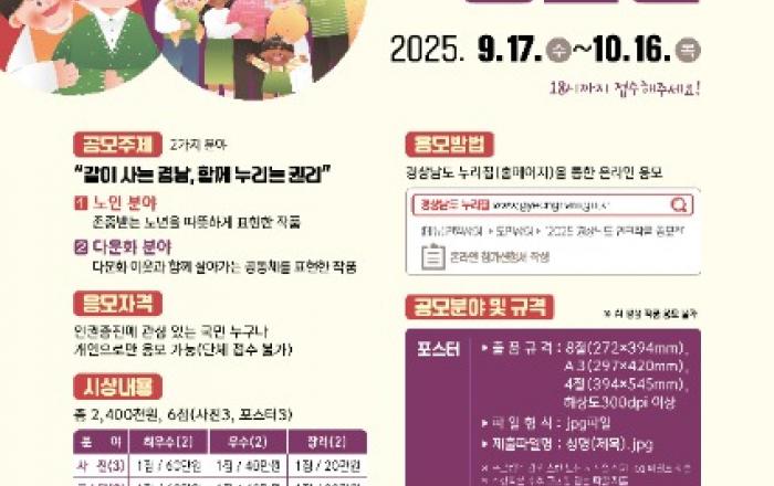 “같이 사는 경남, 함께 누리는 권리”경남도, ‘2025 경상남도 인권작품 공모전’ 개최 - 전국 개인 누구나 참여 가능... 10월 16일까지 온라인 접수- 노인과 다문화에 집중... 포스터·사진 두 분야 공모- 총 6편 선정, 최우수상 60만 원 등 총 상금 240