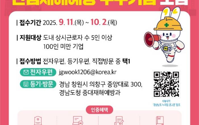 경남도, ‘산업재해 예방 우수기업 인증’ 접수 시작 - 10월 2일까지 접수, 산업재해 예방에 힘쓴 도내 사업장 모집 中- 8개 기업 선정 예정, 이차보전 우대금리 등 각종 인센티브 지원 확대해 경상남도(도지사 박완수)는 ‘2025년 경상남도 산업재해 예방 우수기업 인