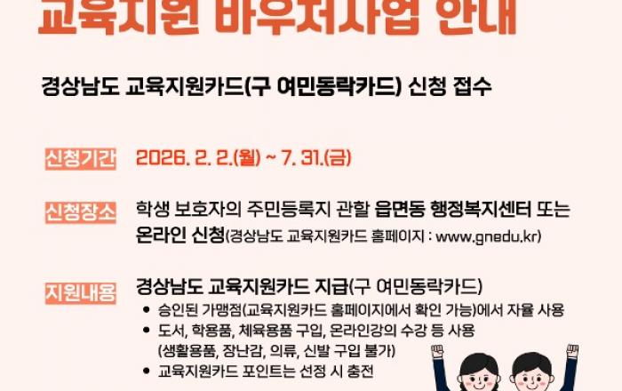 경남도, “교육지원카드 신청하세요” - 2월 2일부터 7월 31일까지 행정복지센터 방문 또는 온라인 신청- 중위소득 70% 이하 가구 초·중·고 학생 대상…선정 시 2월 2일부터 사용- 1인당 10만 원의 포인트 지급…카드 이용 시작 앞당기고, 가맹점 확대 경상남도는