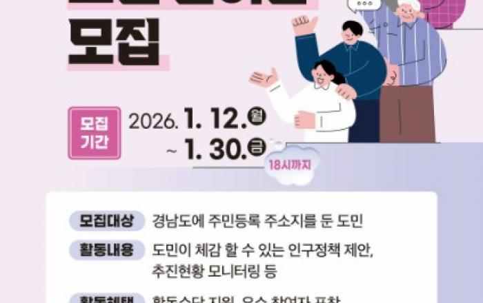 “도민과 함께 설계하는 인구정책”경남도, ‘인구정책 도민 참여단’ 공개 모집... 올해 첫 운영 - 도민이 직접 인구정책 제안·논의하는 상시 참여기구- 1월 12일부터 1월 30일까지 도 공식 누리집 통해 온라인 접수- 경남에 주소지를 두고 인구문제에 관심있는 도민 누