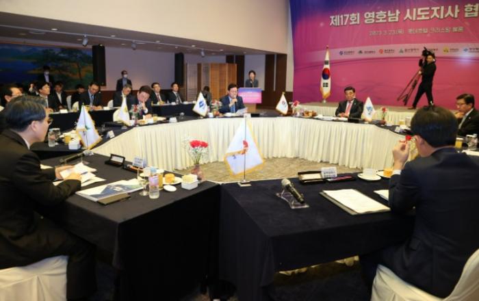 영·호남 8개 시·도지사, 상호교류와 협력을 위해 맞손 - 23일 울산 롯데호텔에서 제17회 영·호남 시도지사 협력회의 개최- 영호남 공동협력과제 8건, 지역균형발전과제 12건 공동성명서 채택- 태평양으로 뻗어나가는 첨단기지 역할에 영호남이 국가발전 중심에 서야 박완수