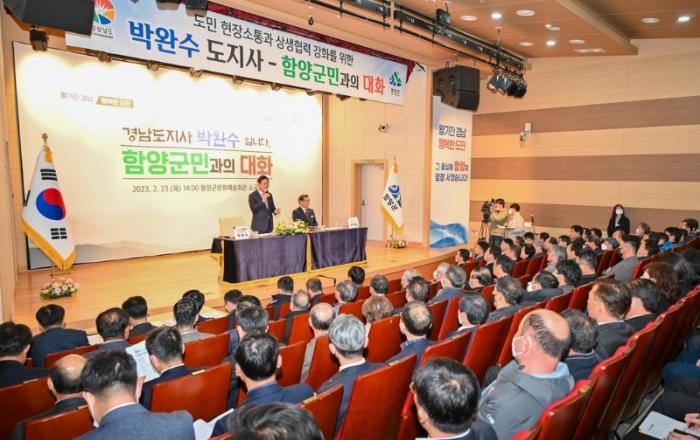 박완수 경남지사 "함양, 교통·물류 중심지 발전 기대"박완수 지사와 진병영 함양군수 박완수 경남지사는 23일 함양군을 찾아 "교통·물류 중심지로 발전이 기대된다"고 말했다.이날 함양군문화예술회관에서 열린 '함양군민과의 대화'에는 진병영 군수 등 군민 200여명이 참석했