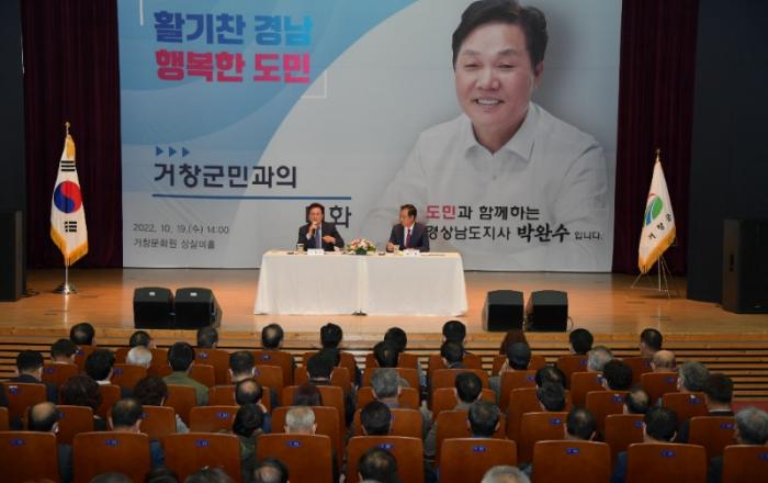 박완수 도지사, 도민을 찾아가는 소통 행보에 눈길 - 19일 거창 방문…거창군민 150여 명 참석, 민선8기 도정비전 공유- 균형발전은 도정의 핵심과제로 거창군의 발전은 중요한 요소 강조- 고속도로, 철도 등 교통 인프라 구축…거창군의 지속 발전에 적극 지원 박완수 경