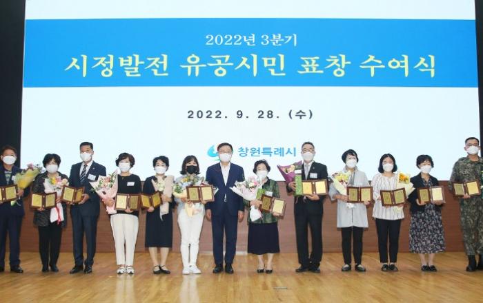 창원특례시, 3분기 시정발전 유공시민 표창 수여식 개최홍남표 시장, 창원시의 빛과 소금에게 감사의 마음 전해창원특례시(시장 홍남표)는 28일 시민홀에서 ‘2022년도 3분기 시정발전 유공시민 표창 수여식’을 개최했다. 수여식은 지역사회와 시정발전을 위해 공헌한 시민 1