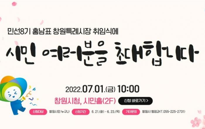 창원특례시, ‘홍남표 창원특례시장 취임식’참여 신청 받는다창원특례시는 7월 1일 오전 10시 시청 시민홀에서 개최되는 ‘제8대 홍남표 창원특례시장 취임식’에 참여할 시민들의 신청을 받는다고 21일 밝혔다.창원특례시장 취임식에 참여하고자 하는 시민은 6월 23일까지 창원