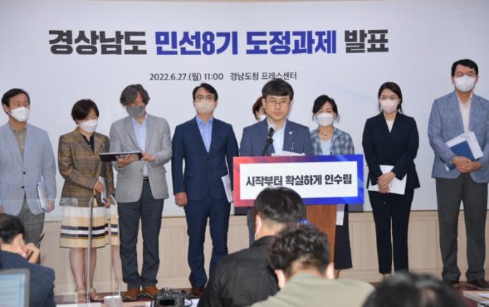 박완수 경남지사 당선인 인수팀, 민선 8기 도정과제 발표경제회복, 일자리 창출 주력박완수 경남지사 당선인 인수팀은 27일 경남도청 프레스센터에서 민선 8기 도정과제를 발표했다. 박완수 경남지사 당선인 인수팀은 27일 경남도청 프레스센터에서 다음달 1일 출범하는 경남도정