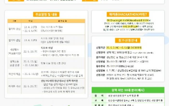 경남청년센터, 경남 MZ 세대 정책 해커톤 모집“내가 제안한 정책이 실현된다면?”- 도내 청년, 청소년 도정 참여 역량 강화 및 정책 참여 환경 조성- 주민참여예산제 청년 참여형의 취지를 알리는 ‘열린 논의의 장’ 마련(재)경남연구원(원장 직무대행 김태영)에서 운영 중