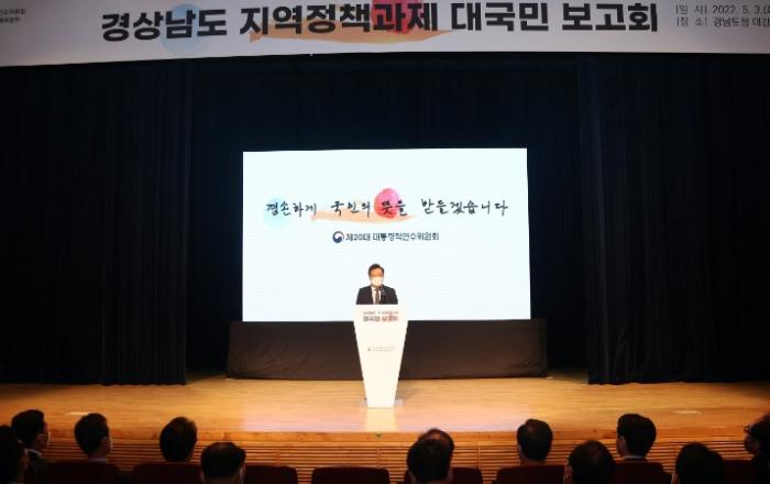 인수위, SMR원전산업 육성 ․ 항공우주청 설립 등 경남 정책과제 발표 - 3일 도청에서 … 7대 공약, 15대 정책과제 공개- 진해신항 조기착공, 주력산업 구조 고도화 및 첨단산업 육성, 광역교통망 확충 등- 안철수 인수위원장 “대한민국 산업화 견인한 경남 살리는 게