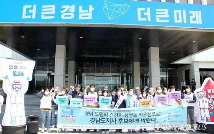 "도민 건강 지표 전국 최하위, 경남도지사가 할 일은?"보건의료산업노조 "서부경남 공공병원 설립, 거창-통영 적십자병원 이전신축" 등 정책 제안큰사진보기전국보건의료산업노동조합은 9일 경남도청 현관 앞에서 "도민 건강과 생명을 최우선으로"라는 구호를 내걸고 경남지사선거