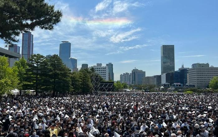 윤대통령 취임식 하늘에 핀 무지개…"대한민국 잘될 것" 尹 취임식, 맑은 하늘에 선명한 무지개참석자들 SNS서 공유하며 '상서로운 일'참모들과 첫 환담서도 무지개 화제文 사저에는 무지개 일종인 햇무리 관측10일 서울 여의도 국회의사당 앞 잔디마당에서 열린 제20대 대