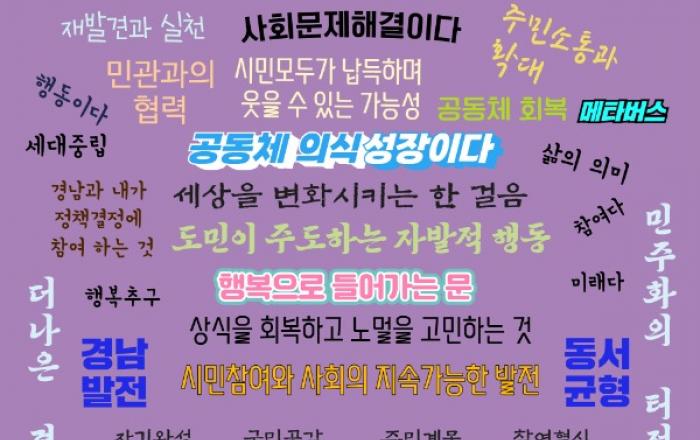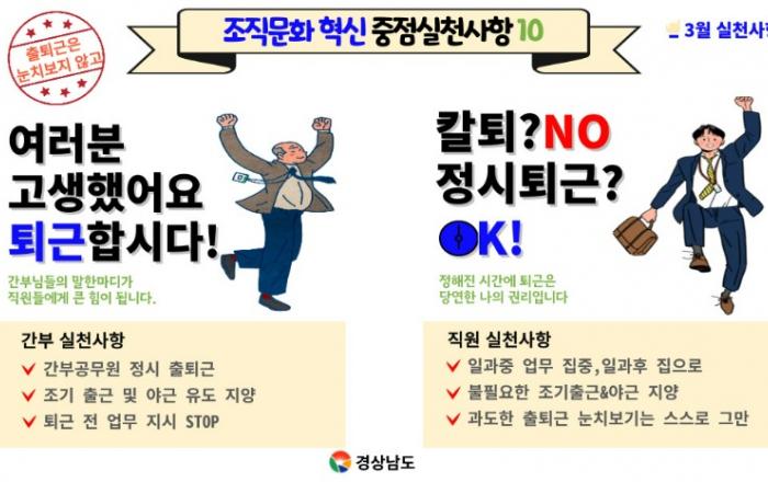 경남도, 변화를 위한 ‘조직문화 혁신’ 본격 시동 - 세대공감동아리 등 조직문화 개선을 위한 다양한 시도 본격 추진- 불합리한 관행 타파하고 긍정적 변화 이끌 10대 중점실천사항 경상남도는 변화하는 시대 흐름에 발맞춰 기존의 공직사회를 더 나은 방향으로 개선하기 위하여