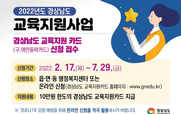 경남도, ‘2022년 경상남도 교육지원사업’ 추진 - 중위소득 70% 이하 가구 초중고 학생 대상 교육지원카드 지급- 1인당 10만 원 지급, 카드 사용 시작 시기 앞당기고 신청 기간 늘려- 17일부터 신청‧사용 가능, 행정복지센터 방문 또는 온라인으로 신청 경상남도는