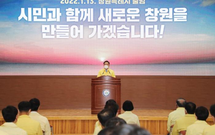 창원시, 시무식으로 ‘2022 특례시 출범 원년’ 시작 ‘대전환의 서막, 창원 특례시’를 시정 목표로 멈춤없는 전진 주문 창원의 새 미래 열고 시민 삶 획기적으로 변화시킬 한해 뜨겁게 출발 창원시(시장 허성무)는 3일 시민홀에서 5급 이상 간부공무원 80여 명이 참