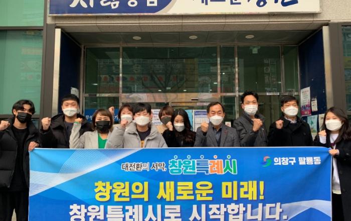 창원특례시 출범, 팔룡동 전직원의 힘찬 응원- 2022. 1. 13. 창원의 새로운 미래, 창원특례시 출범을 응원하고 전 시민 홍보- 의창구 팔룡동(동장 강성만)은 지난 5일 창원의 새로운 미래, 창원특례시 출범을 앞두고 전직원과 함께 힘찬 응원의 메시지를 전달하고