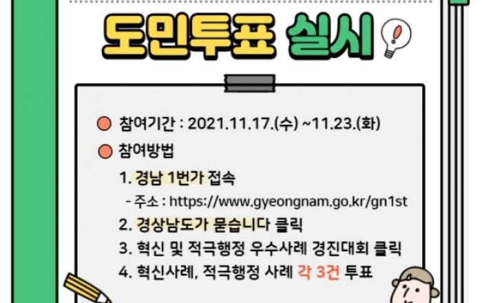 경남도, ‘혁신 및 적극행정 우수사례’ 온라인 도민투표 실시 - 11월 17~23일 경남1번가, 우수사례 16건 대상 온라인 도민투표 진행- 혁신적․적극적 도민공감 ‘혁신 및 적극행정 우수사례’ 분야별 3건 투표경상남도는 ‘2021년 혁신 및 적극행정 우수사례 도 통합