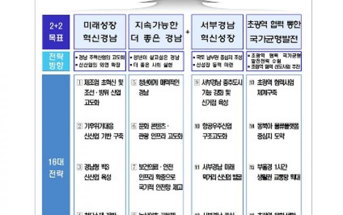 道, ‘스마트·그린특별도 경남’ 위한 새정부 전략 과제 제안‘미래성장’, ‘지속가능’, ‘서부경남’, ‘초광역협력’ 키워드2+2 목표 ․ 16대 전략 ․ 64개 과제 ․ 76개 사업 및 5개 선도사업 전국화 건의경남도(도지사 권한대행 하병필)가 내년 새정부 출범에 발맞