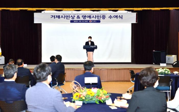 거제시민상&명예시민증 수여식 및 코로나 19 백신접종 경품 추첨행사 개최 거제시(시장 변광용)는 6일 시청 블루시티홀에서 거제시민상&명예시민증 수여식 및 코로나 19 백신접종 경품 추첨행사를 개최했다. 수여식 및 추첨식은 당초 ‘제27회 시민의 날 행사’에서 부대행사로