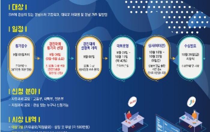 제1회 경남 소프트웨어(sw) 경진대회 개최 - 경남 소프트웨어(sw) 스마트인재 발굴 위한 경진대회 개최- 9월 8일부터 40여 일간 진행 예정, 9월 5일까지 참가 신청 가능- 지역 기업 수요기반 과제해결을 통한 소프트웨어(sw) 인재양성 생태계 구축 경상남도는 도