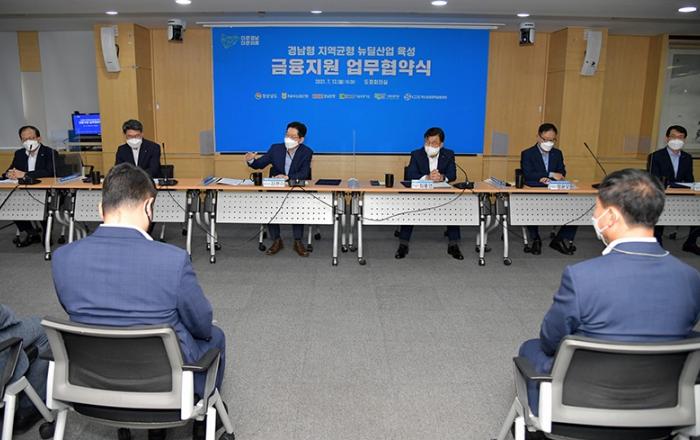 경남도, 지역균형 뉴딜산업 육성 금융지원 업무협약 체결뉴딜분야 중소∙벤처기업에 협약대출 1,000억 원, 특례보증 200억 원 지원김경수 지사 “기업인들 늘 자금 문제 어려워해...지역 혁신기업에 ‘마른 논에 대는 물’ 되길” 경상남도와 nh농협은행, bnk경남은행,