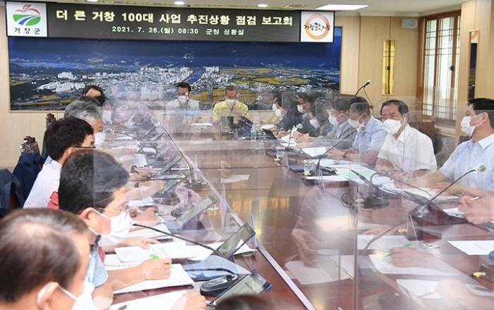 거창군, 더 큰 거창을 향한 100대 사업 추진상황 보고회 가져거창군은 26일 구인모 군수 주재로 군청 상황실에서 간부공무원이 참석한 가운데 더 큰 거창 100대 사업 추진상황 점검보고회를 개최했다.이번 보고회는 ‘더 큰 거창, 군민 행복시대’의 군정 비전 실현이라는